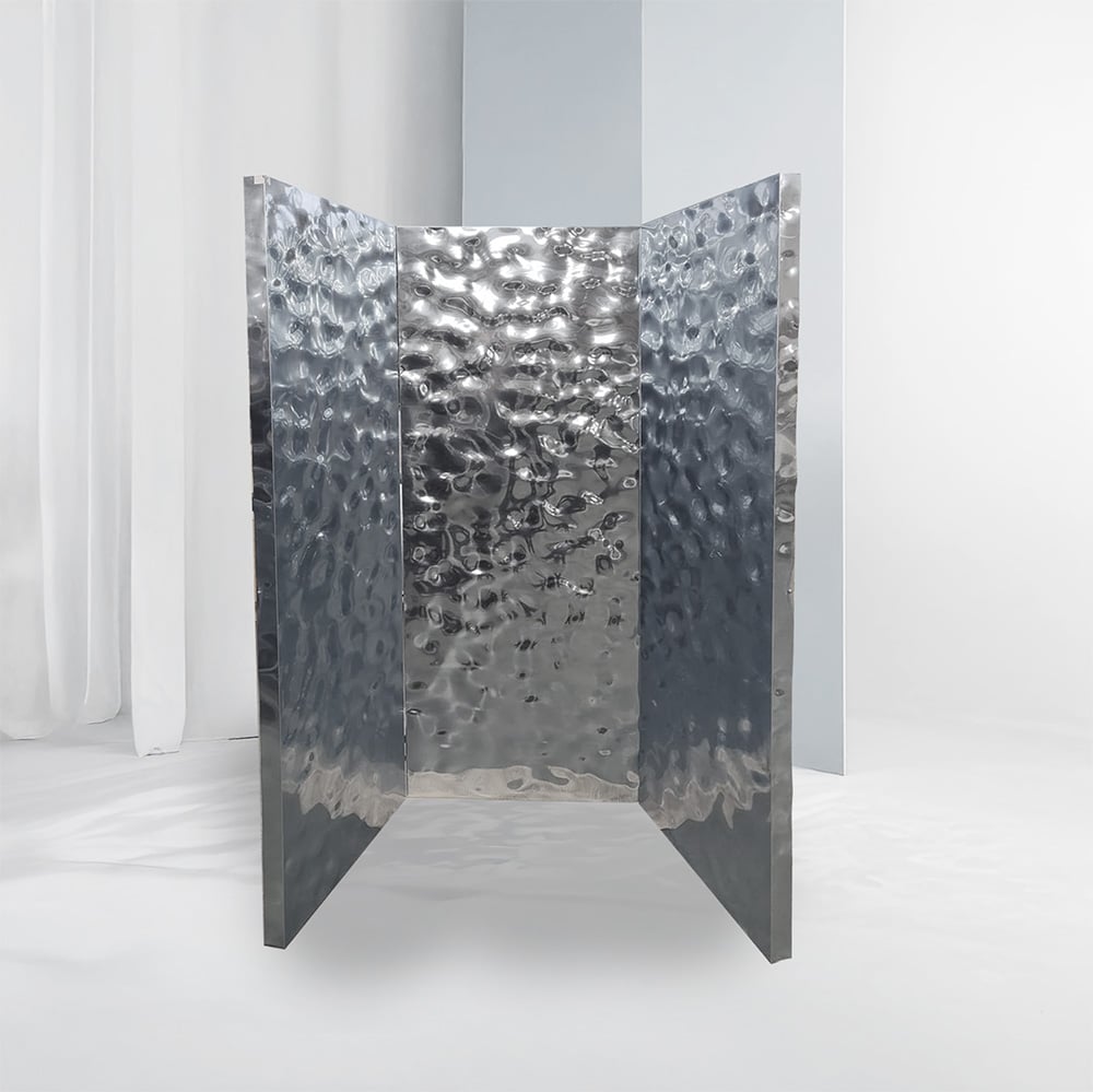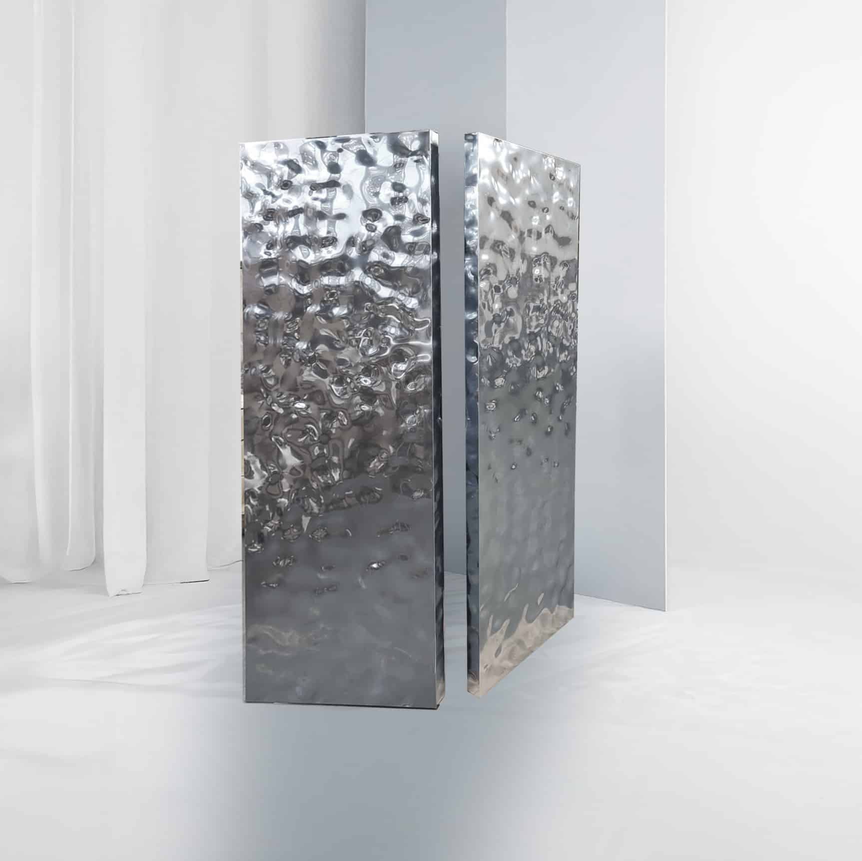 The result is a sculptural mirror surface with fluid, distorted and vibrant reflections, creating immersive visual experiences on walls, ceilings and architectural elements.