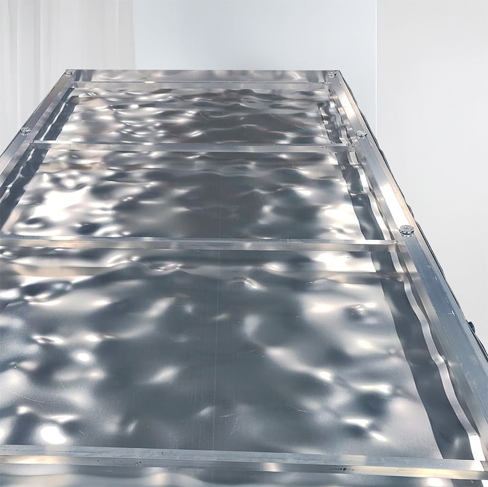 It is a ready-to-install modular rippled mirror panel, pre-folded and stabilised to create a controlled water-effect reflective surface.