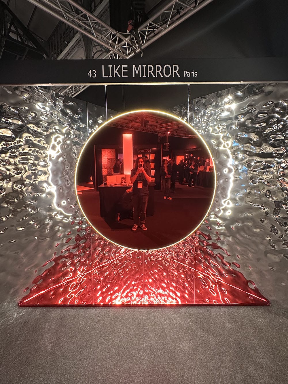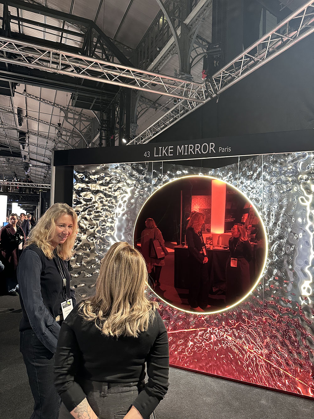 Tout au long du salon, de nombreux visiteurs se sont arrêtés pour observer, discuter ou simplement se prendre en photo devant l’installation. Architectes, designers d’intérieur, scénographes ou responsables de projets retail ont été particulièrement sensibles au caractère expérientiel et à la qualité de finition de nos surfaces miroir.