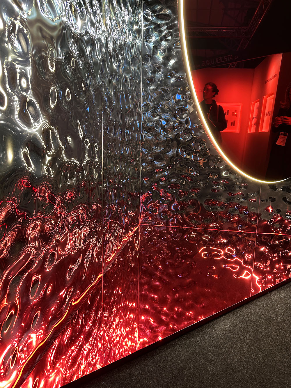 Présentée en fond du stand, cette plaque en aluminium miroir travaillée en surface crée un effet d’ondulation organique et fluide. Le jeu de lumières et de reflets offre une perception mouvante, presque liquide, de l’espace. Associée à la lumière rouge réfléchie par le miroir rouge central et du sol, elle renforçait l’effet immersif de l’ensemble et donnait l’impression qu’une mer rouge sang infiltrait les murs.