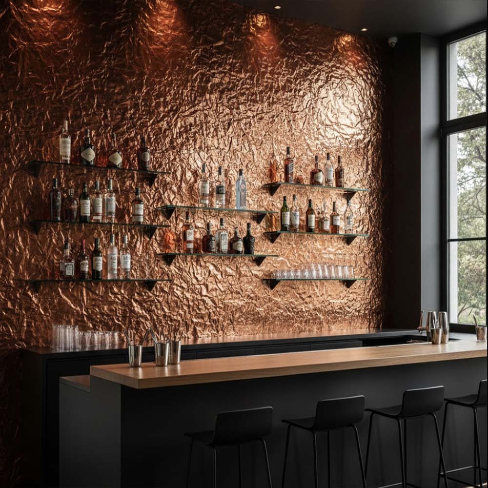 Selon l’éclairage, la surface révèle des reflets orangés, rosés ou brunis. Cette variation chromatique permanente crée une vibration visuelle qui enrichit l’espace et renforce l’identité des lieux.