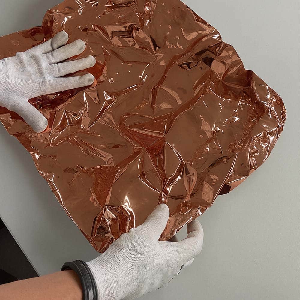 Le Form’It Cuivre repose sur un support technique à mémoire de forme recouvert d’un film miroir cuivre. Une fois plié, froissé, cintré ou sculpté, le matériau conserve durablement la forme qui lui est donnée. Cette propriété permet de créer des volumes, des drapés ou des textures impossibles à obtenir avec un miroir rigide.